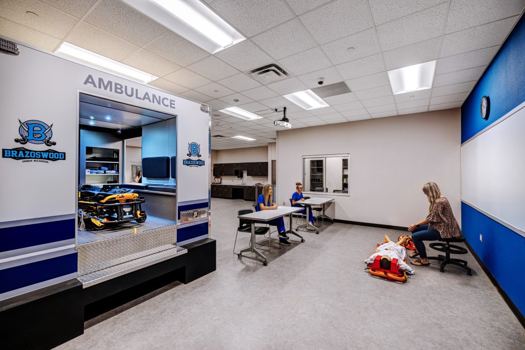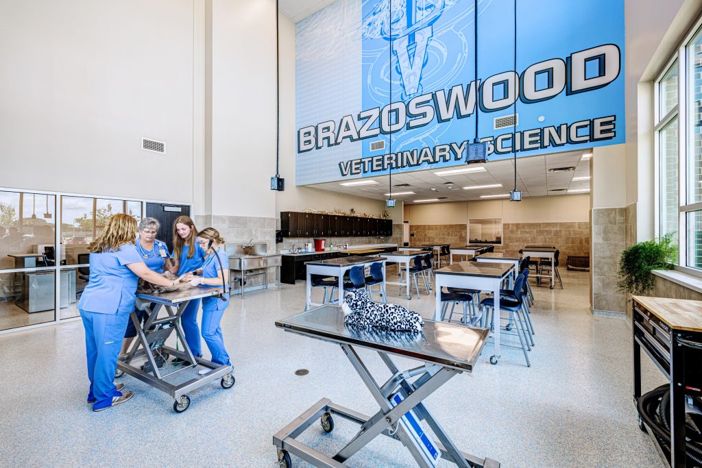 DBR Engineering worked with VLK Architects on the newly constructed Brazoswood High School Career & Technical Education (CTE) Center in Clute, Texas for Brazosport ISD. The 91,000-square-foot facility includes classrooms, laboratories, and program spaces for culinary arts, welding, manufacturing, veterinary technology, floral design, health sciences, information technology, and general STEM education. The building also features a business lab, a cosmetology lab, and a broadcasting studio.